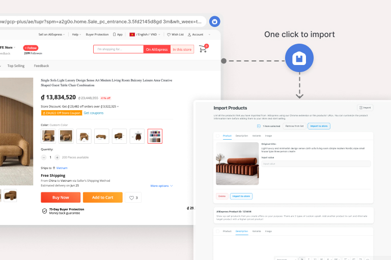 One click to import and sync products from AliExpress to your store.