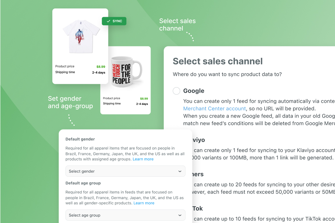 Create product feeds to use on sales channels like Facebook and Google Shopping.